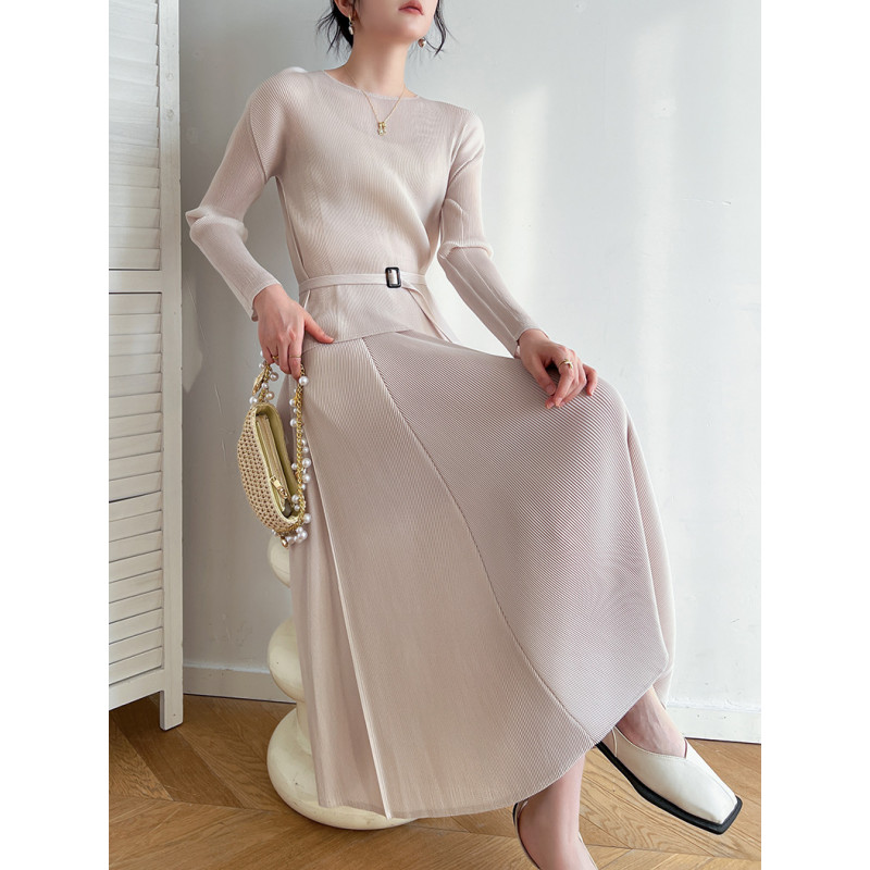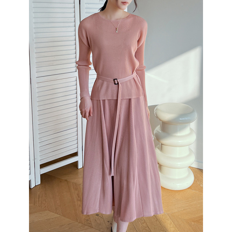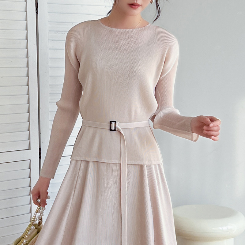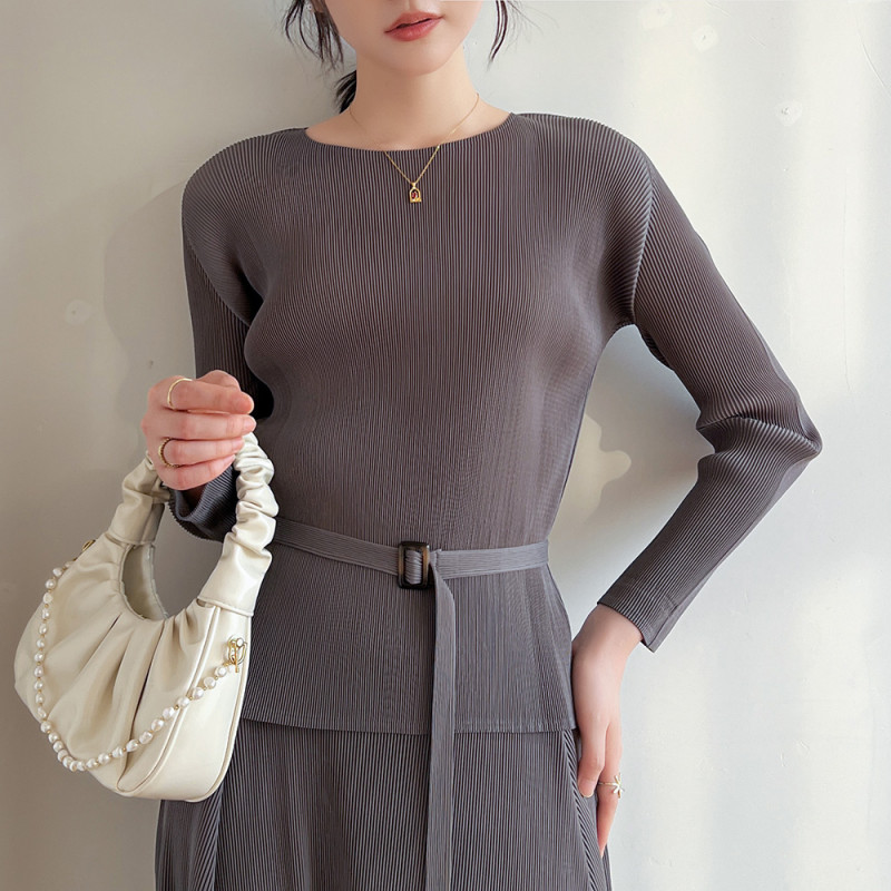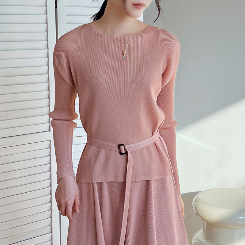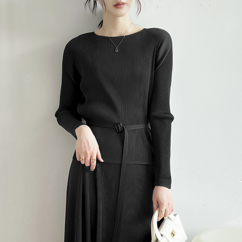 【羽生摺衣】i摺衣-日系 簡約風 圓領 腰帶 長袖 上衣(共二色)